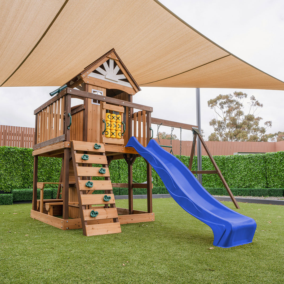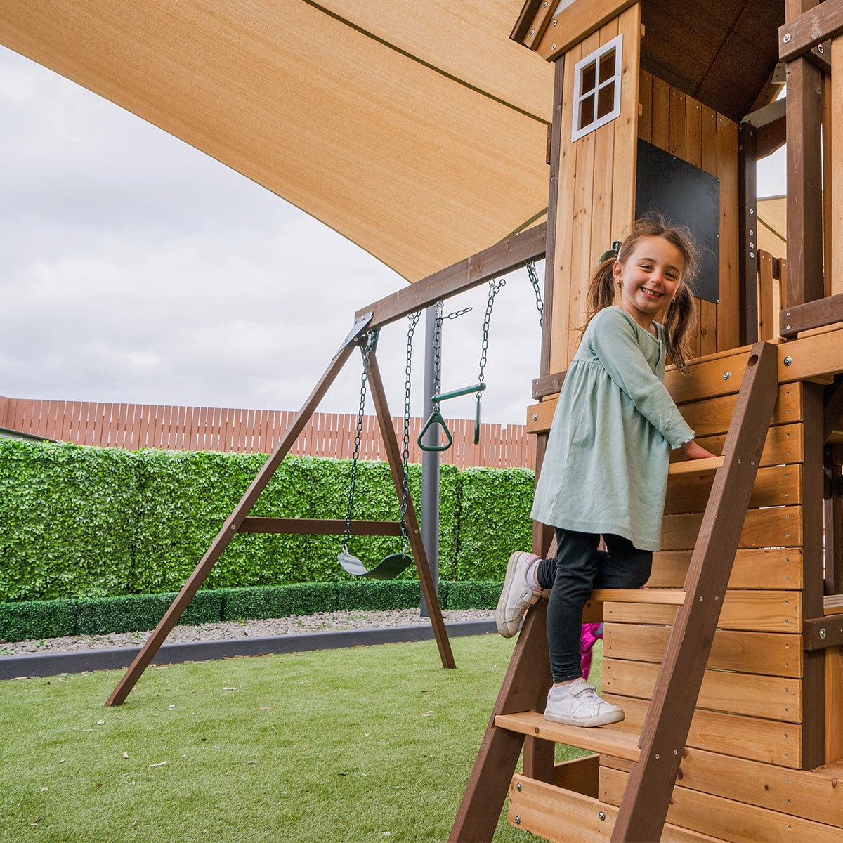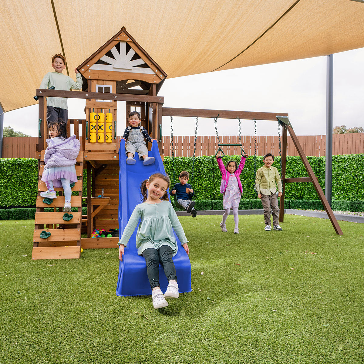 Transform your backyard into a stylish haven for your little ones with the Coventry Play Centre Set. Its modern design and vibrant colours are sure to brighten up any outdoor space. The 2.2m green slide stands out against the natural wood, and is complemented by a rock-climbing wall, two swings, a trapeze and a play kitchen in the hideaway area. Climb up to the top to enjoy a spacious upper fort area, which can double as a cozy cubby house. Made from sustainably sourced timber and high-strength steel brackets, it combines durability with eco-friendly design. Rigorously tested to Australian Standards, this play centre ensures safe and exciting outdoor adventures for your family while enhancing the look of your backyard.
