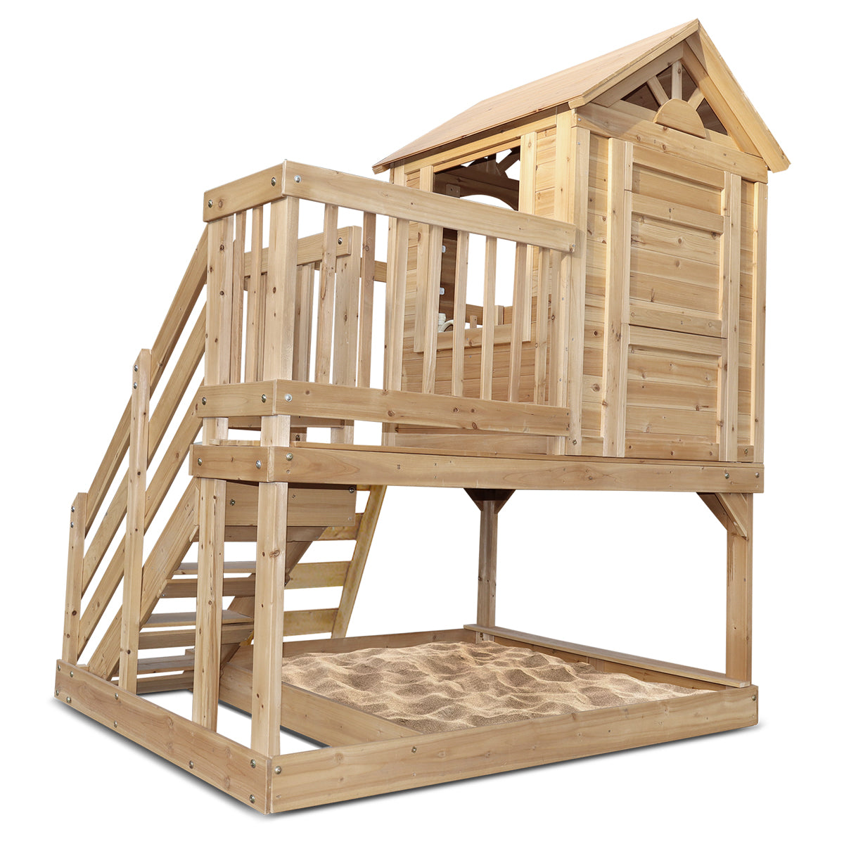 Raised playhouse with light, easy to use door and sunburst windows